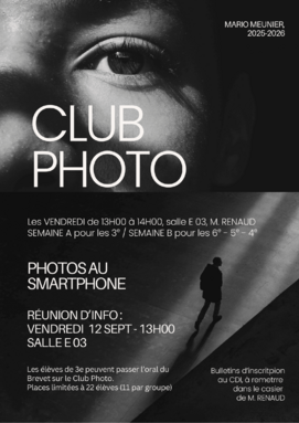 POUR LES 3e : vous êtes prioritaires pour vous inscrire. Il est possible, si vous le souhaitez, de passer l'oral du Brevet sur le Club Photo en fin d'année (PEAC).