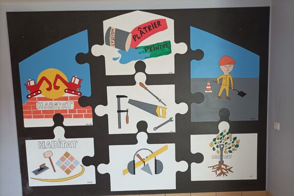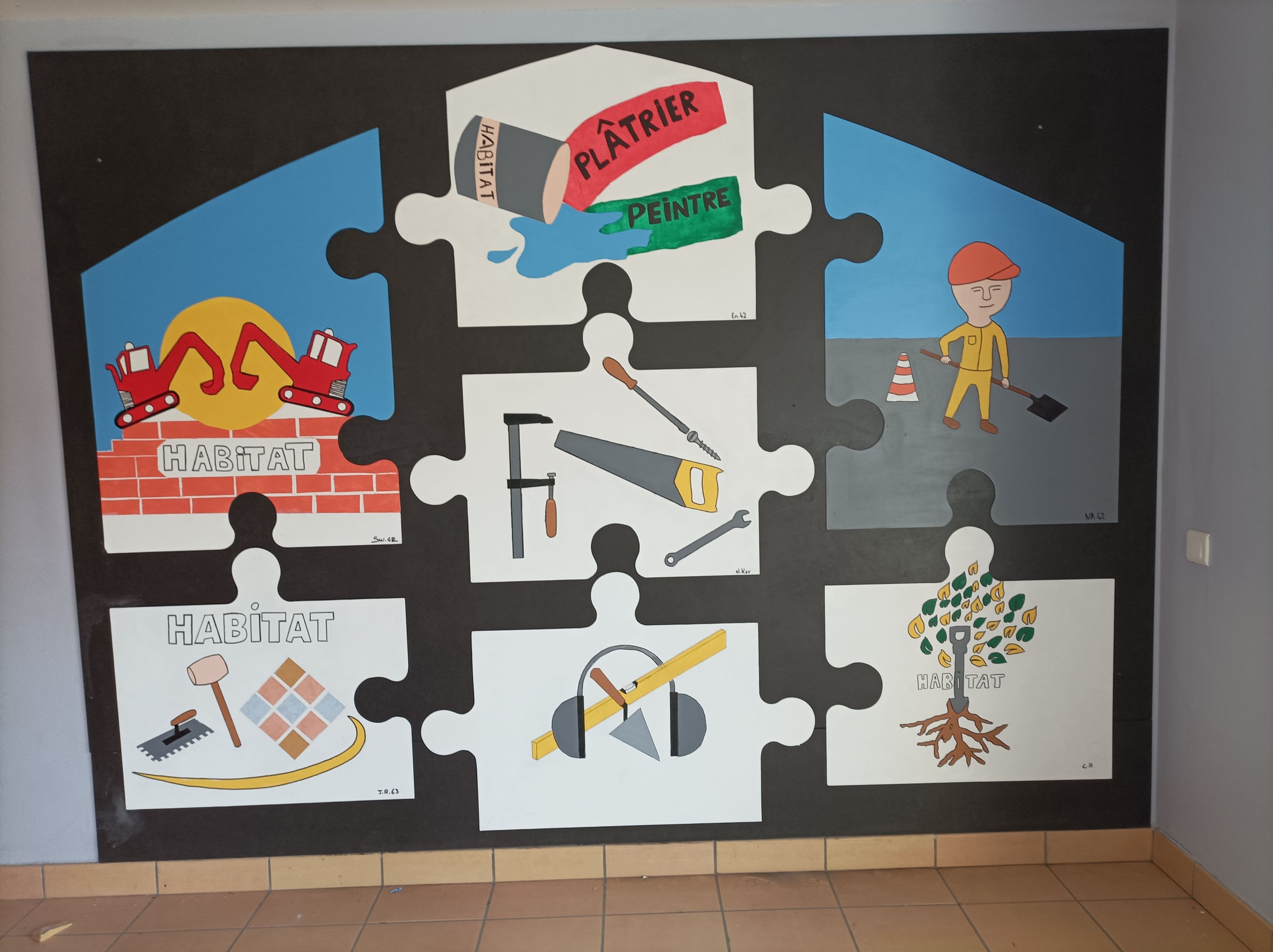 Parmi les 30 logos réalisés, les 7 meilleurs ont été sélectionnés pour réaliser une fresque murale à l’entrée de l’atelier habitat au rez-de-chaussée du bâtiment Allard.