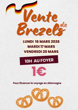 vente de bretzels au collège lundi 16 mars, mardi 17 mars et vendredi 20 mars à 10h au foyer pour financer le voyage en Allemagne.