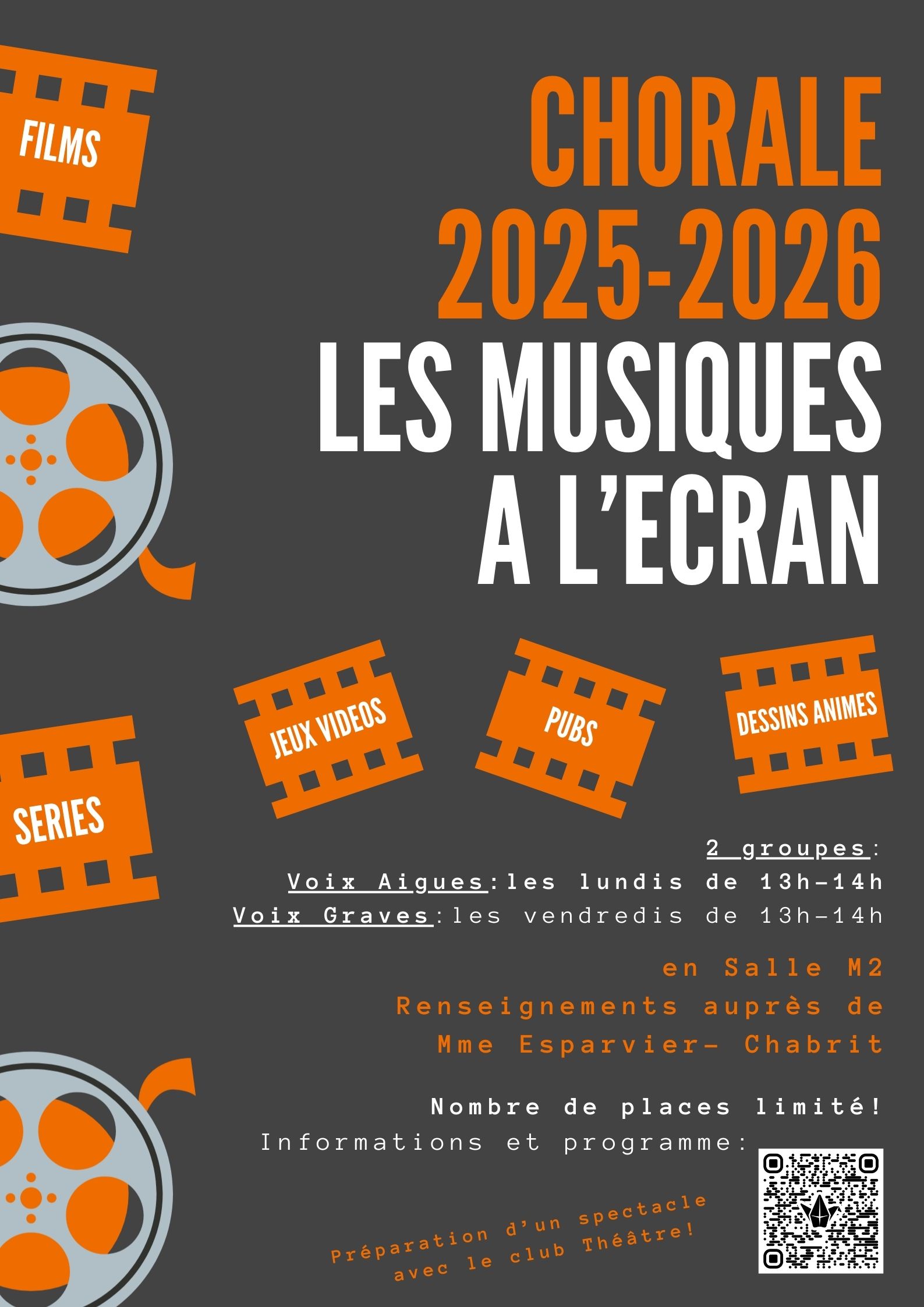 La chorale cette année prépare un très beau projet autour des « MUSIQUES A L’ECRAN », en partenariat avec le club théâtre du collège et l’école primaire Brillié de Montbrison. Ce projet aboutira à deux concerts en fin d’année : le VENDREDI 29 MAI 2026 à la salle Guy Poirieux .